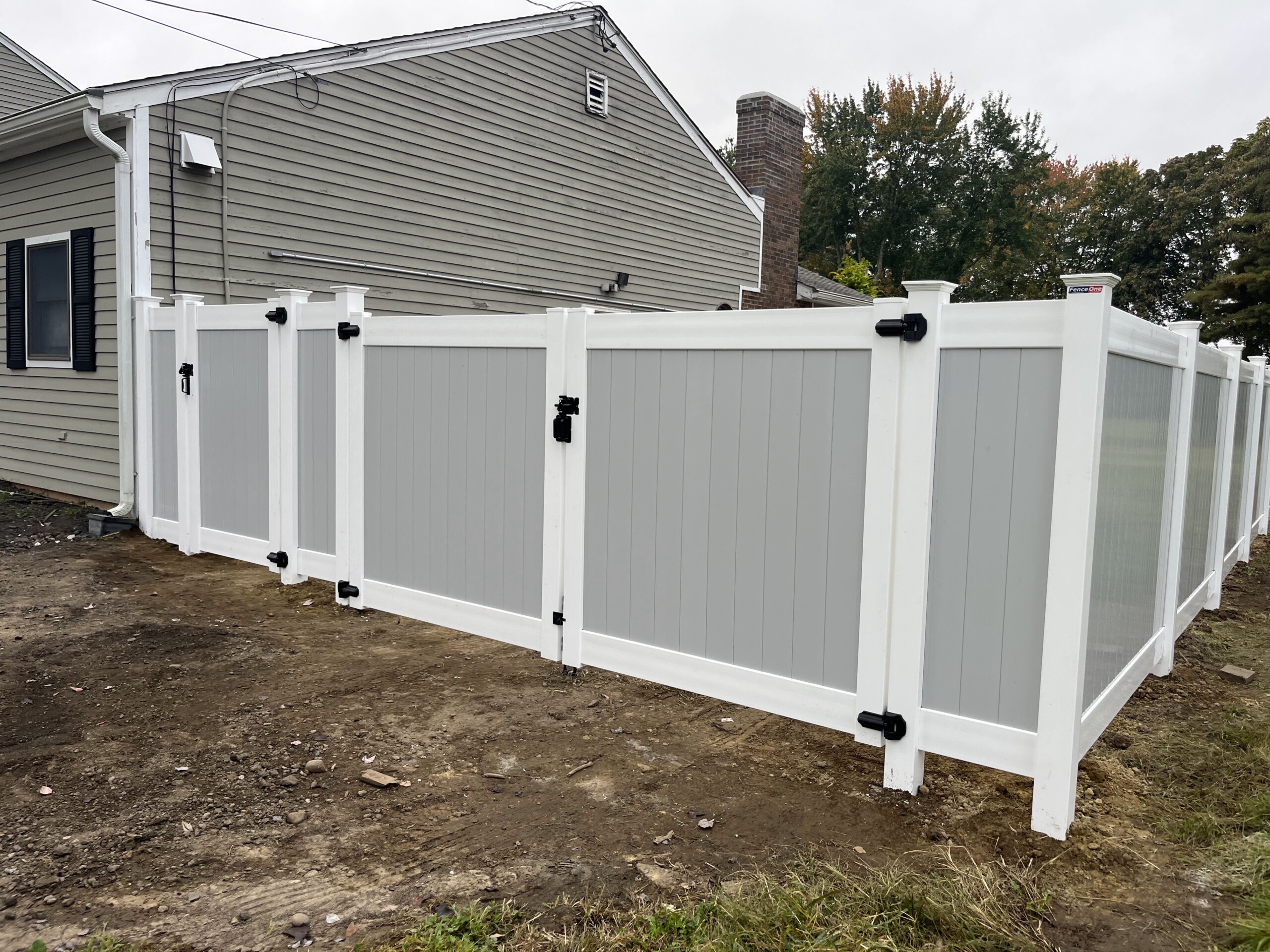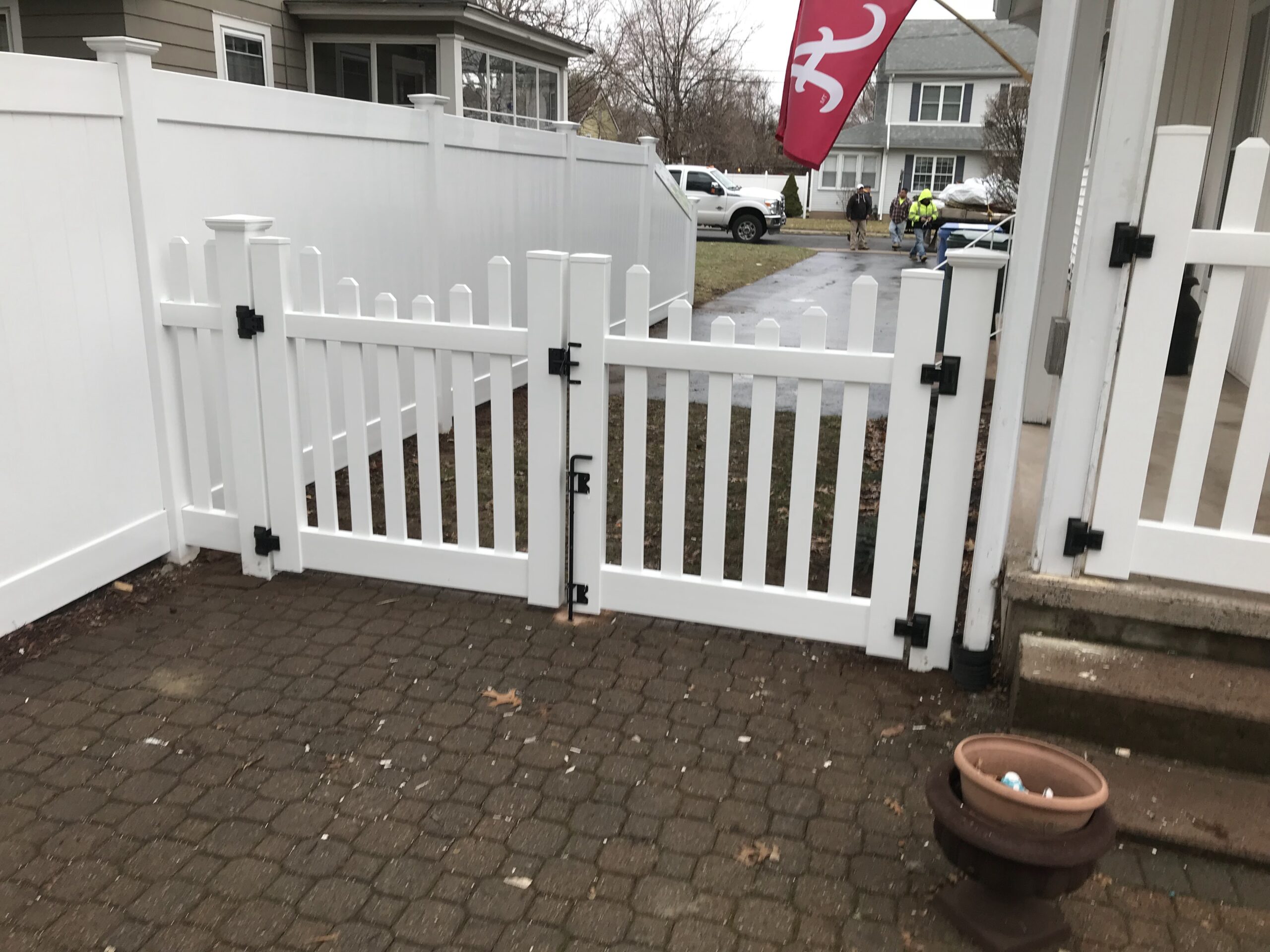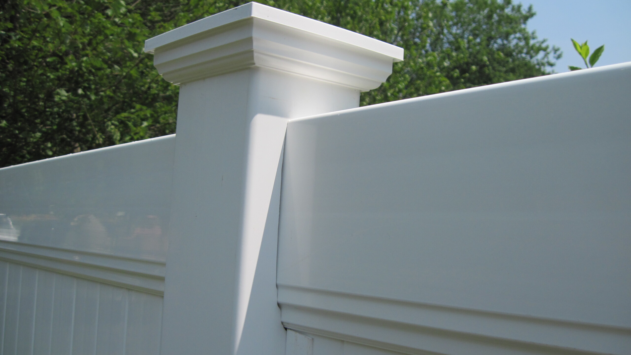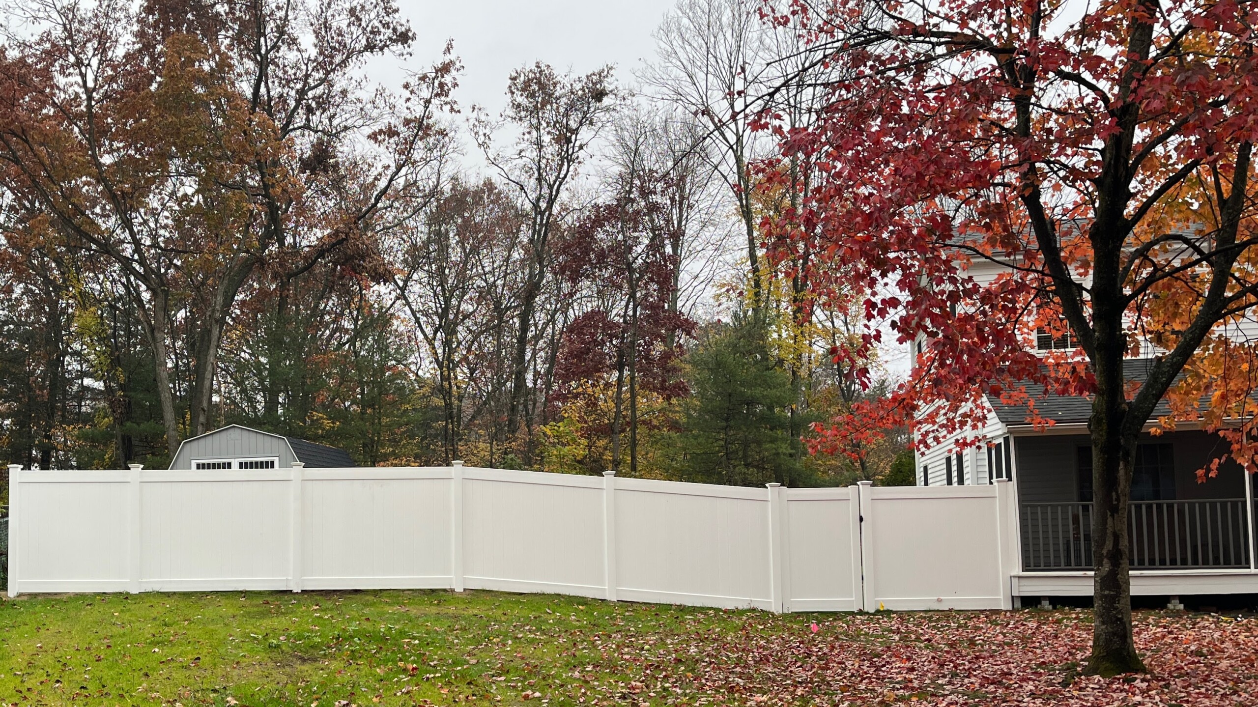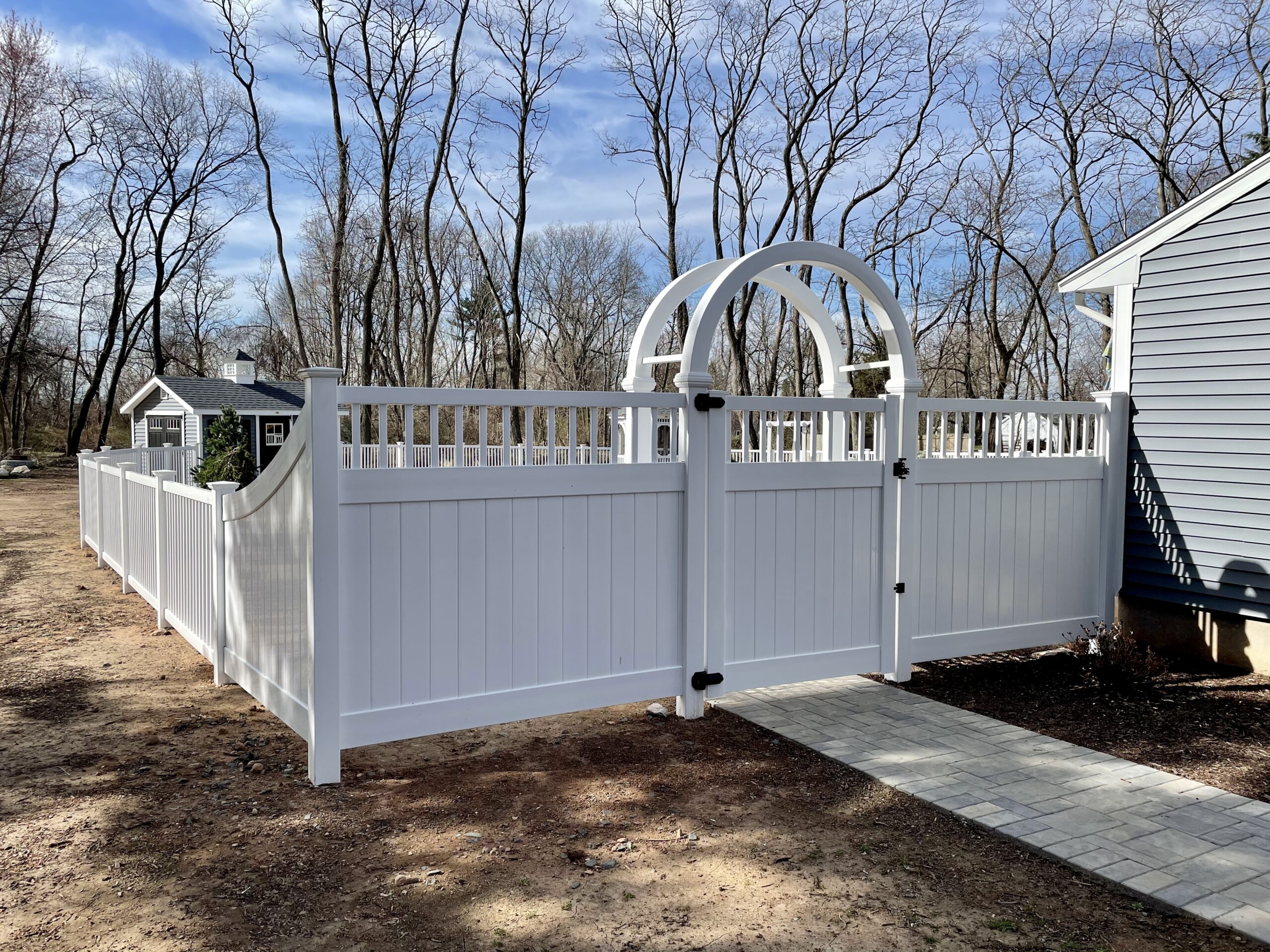 At Fence One we take our materials seriously. Not all vinyl fences are manufactured the same and not all fence companies install them the same. You have probably seen countless examples of white vinyl fences many sold by the ‘big box home stores’ that quite simply look awful. This is NOT what we sell or install. Our vinyl fences are all manufactured in the USA and are designed with a system where both the top and bottom rails go into each post. This is much like a ‘post and beam’ house. Our posts are a full 5″x5″ with a minimum of 36″ to 42″ of the post in the ground. We mix concrete on site whereby every post is secured in concrete to ensure your fence will not move over the years due to frost or wind. That means when we install your fence it will retain its even flow and lines for years to come.Most yards in Connecticut are not perfectly level. We install your fence to accommodate the natural flow of your property by custom cutting rails and pickets to follow the grade of your yard. This means we DO NOT step your fence like a staircase, but maintain an even flow that creates a dramatic and professional appearance that is pleasing to the eye. This type of installation means we avoid installing a fence with large gaps or spaces under the fence which is especially important with children and pets.
