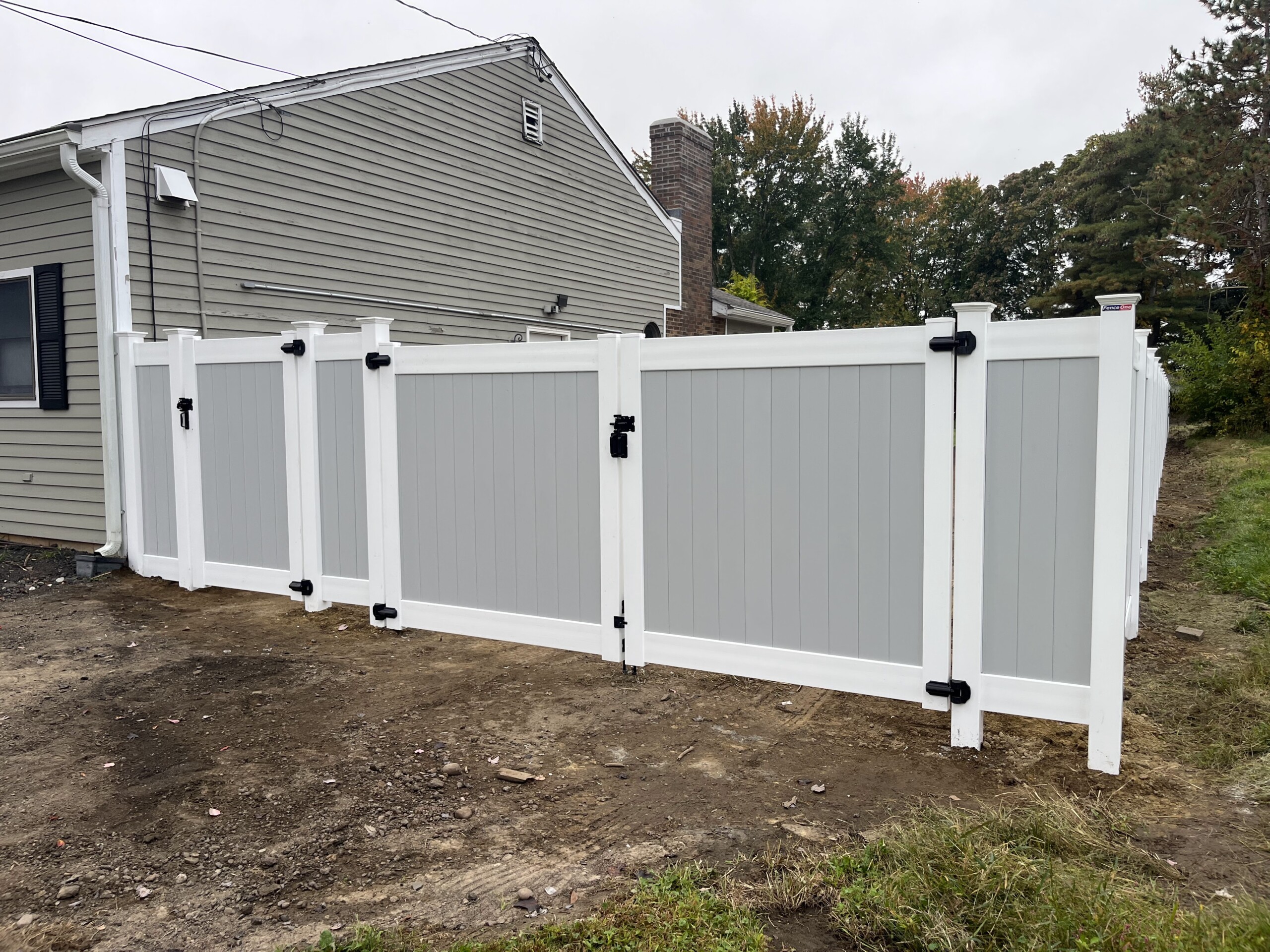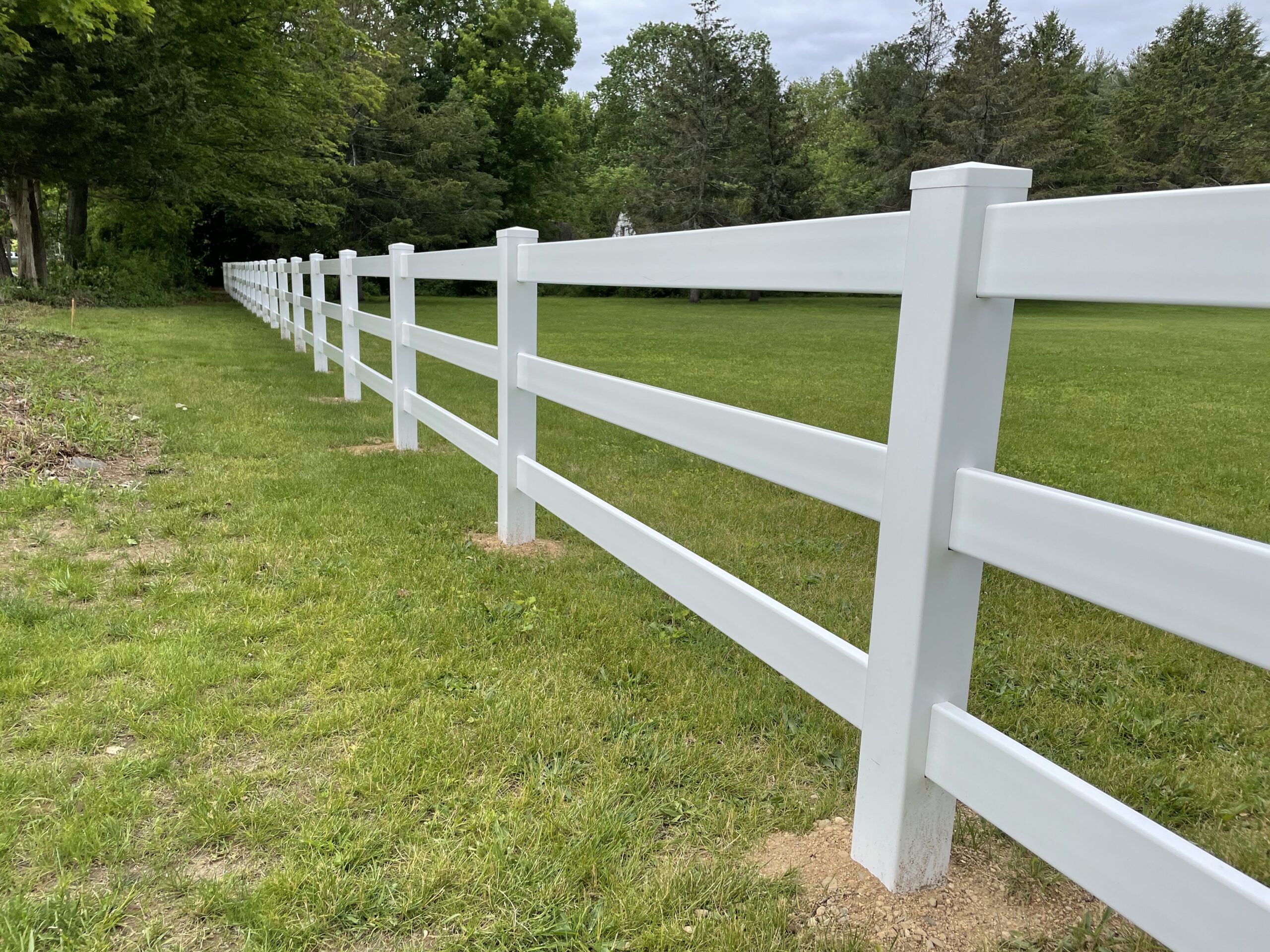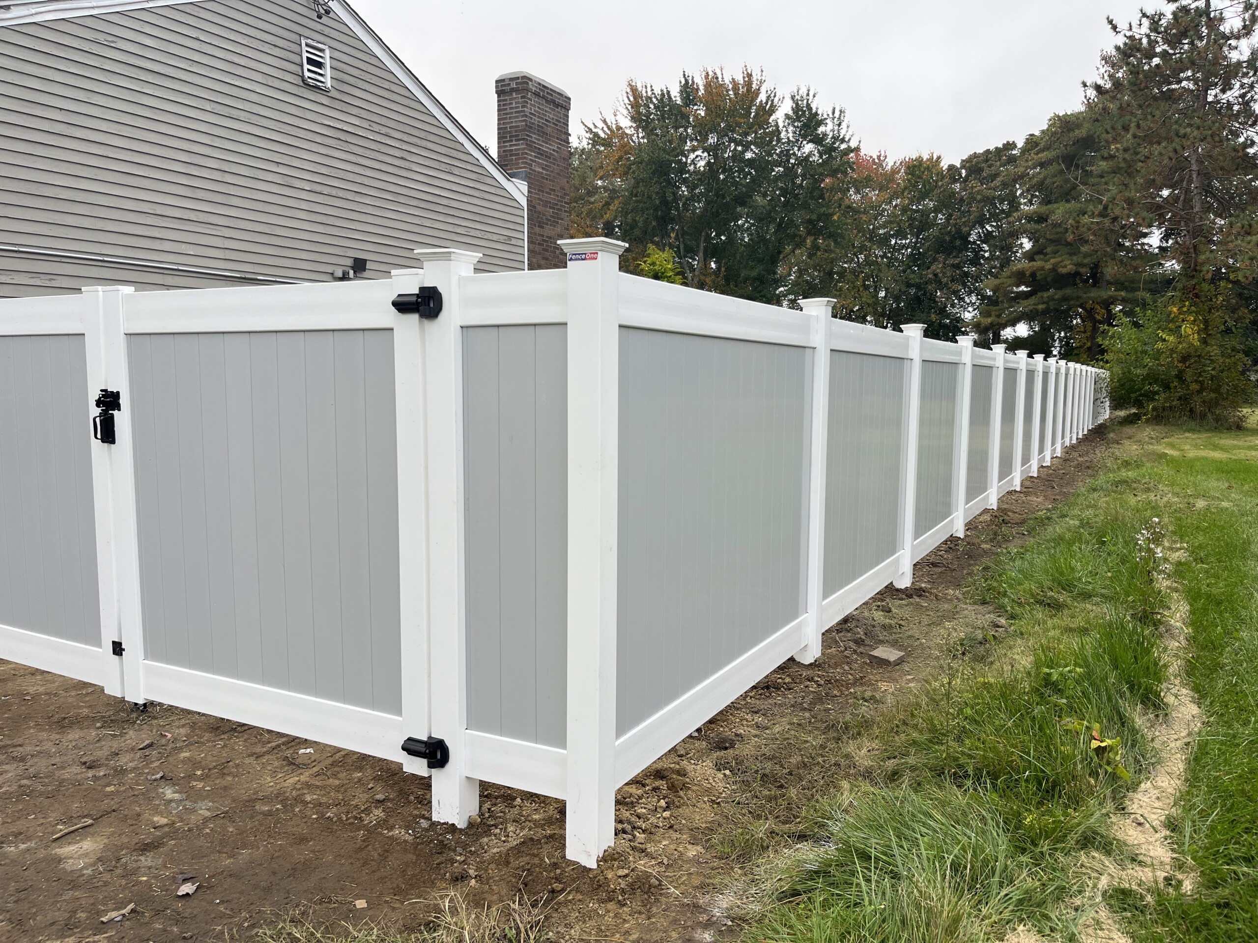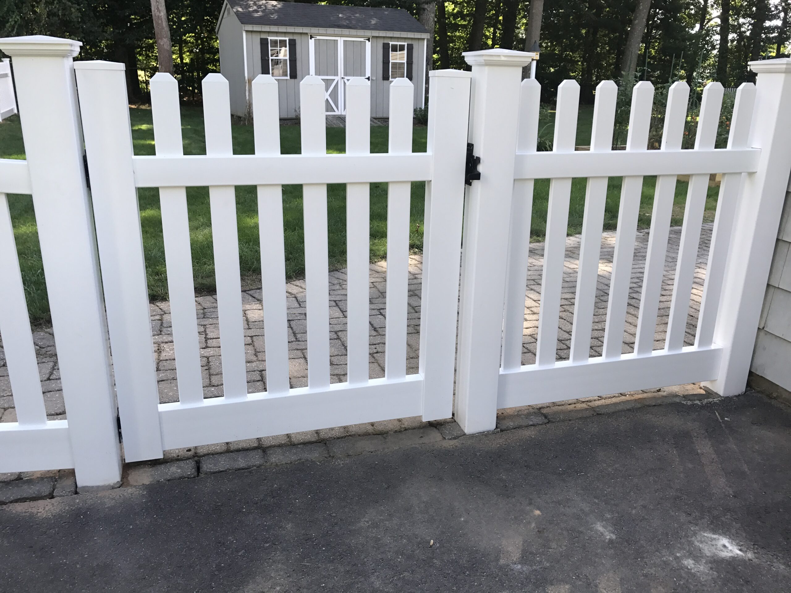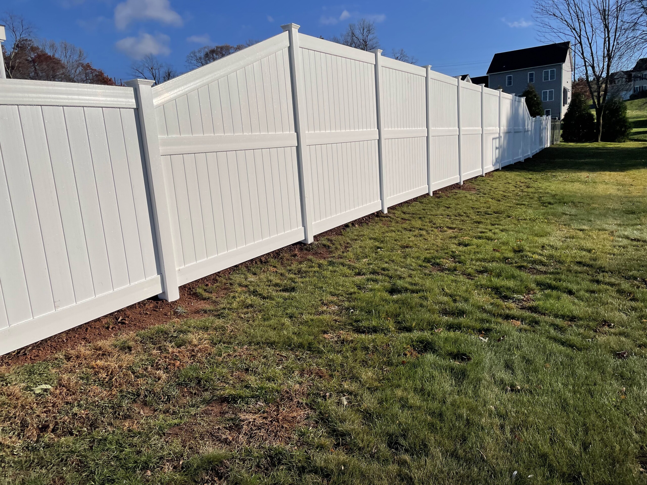 At Fence One we take our materials seriously. Not all vinyl fences are manufactured the same and not all fence companies install them the same. You have probably seen countless examples of white vinyl fences many sold by the ‘big box home stores’ that quite simply look awful. This is NOT what we sell or install. Our vinyl fences are all manufactured in the USA and are designed with a system where both the top and bottom rails go into each post. This is much like a ‘post and beam’ house. Our posts are a full 5″x5″ with a minimum of 36″ to 42″ of the post in the ground. We mix concrete on site whereby every post is secured in concrete to ensure your fence will not move over the years due to frost or wind. That means when we install your fence it will retain its even flow and lines for years to come.Most yards in Connecticut are not perfectly level. We install your fence to accommodate the natural flow of your property by custom cutting rails and pickets to follow the grade of your yard. This means we DO NOT step your fence like a staircase, but maintain an even flow that creates a dramatic and professional appearance that is pleasing to the eye. This type of installation means we avoid installing a fence with large gaps or spaces under the fence which is especially important with children and pets.